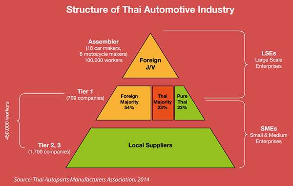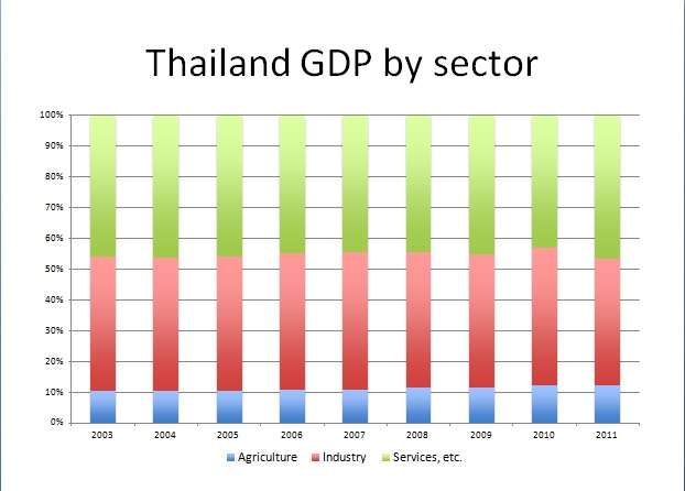 工业 :制造业产值占GDP比重超过40%。制造业主要门类有:采矿、纺织、电子、塑料、食品加工、玩具、汽车装配、建材、石油化工等。泰国盛产橡胶,汽车是泰国的第一大支柱产业。