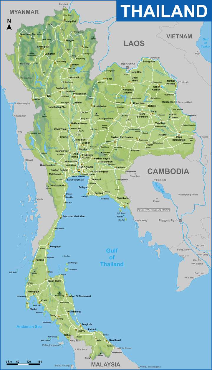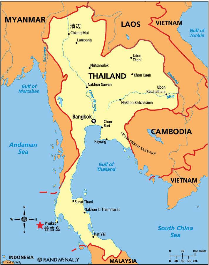 泰国位于中南半岛中部,其西部与北部和缅甸、安达曼海接壤,东北边是老挝,东南是柬埔寨,南边狭长的半岛与马来西亚相连。