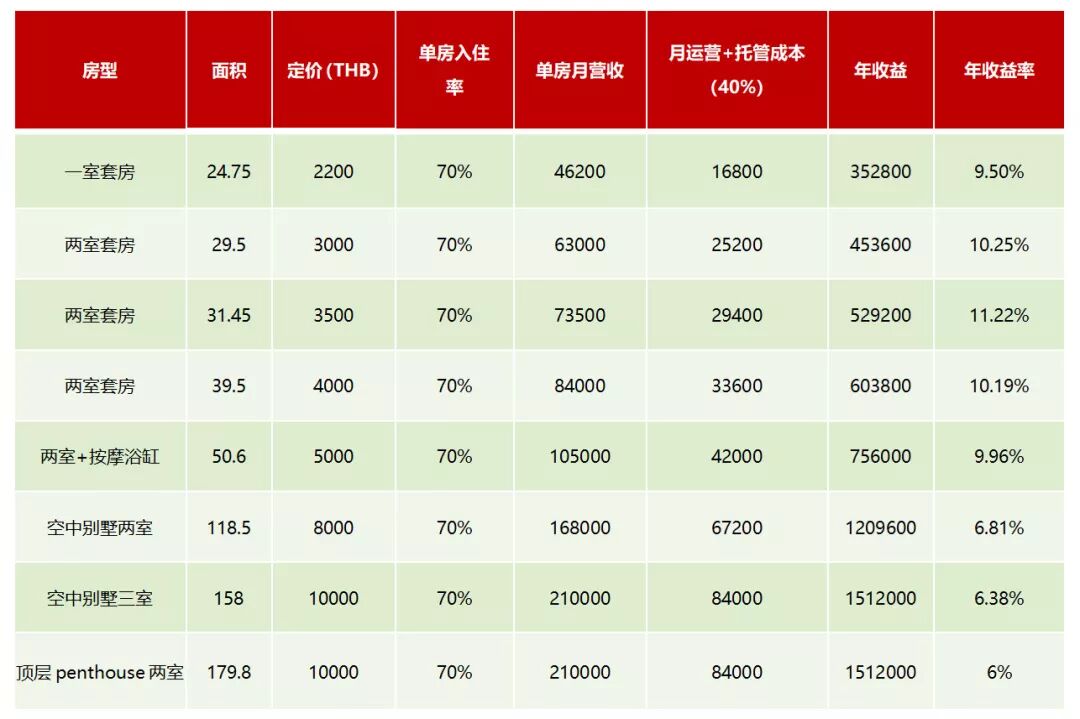 除了房价低的优点,出租回报率也是一个亮点。芭提雅的出租收益一般在8%-10%左右,地段好的收益更高,络绎不绝的游客是出租的保障,况且很多开发商都会有几年的包租福利。