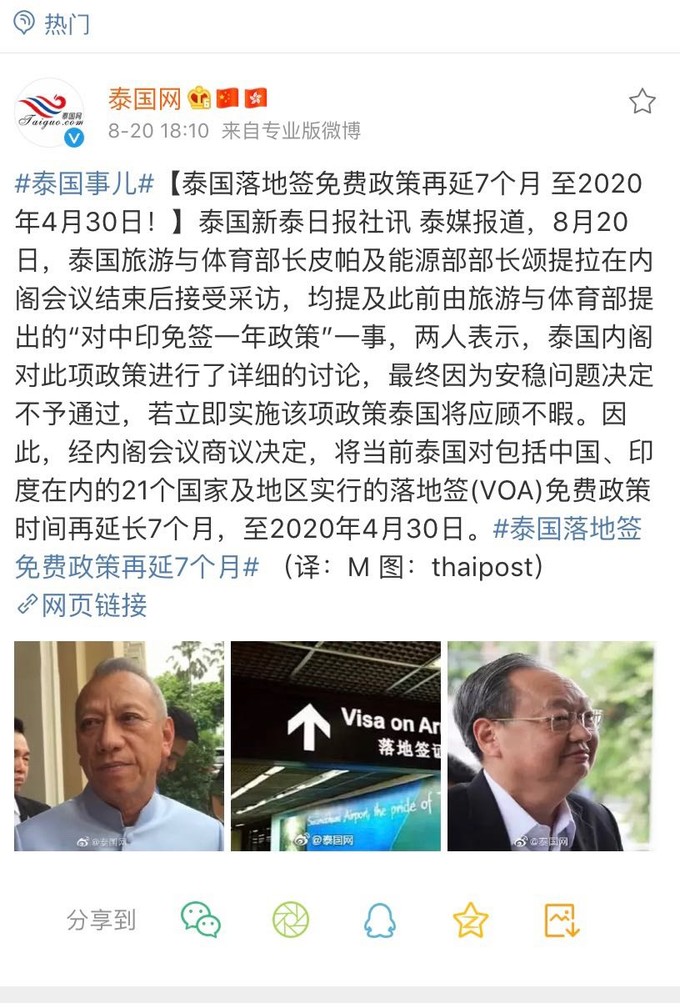 8月20日,泰国旅游与体育部长皮帕和能源部长颂缇拉在内阁会议后接受采访时表示:内阁会议已经同意将包括中国在内的21个国家及地区实行的落地签(VOA)免费政策继续延长至2020年4月30日。