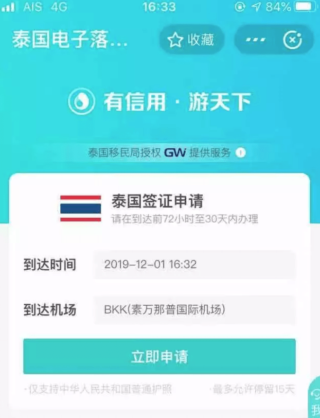 第三步,输入预计到达泰国日期时间及机场,点击立刻申请(时间范围需在到达前 72 小时以上至 30 日以内)