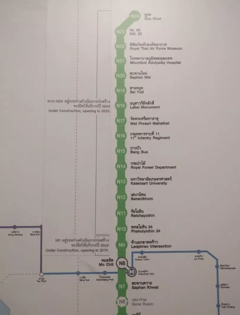 N13 Kasetsart University而至 N24 的 Khu Khot 站也将于 2020 年下半年开通。届时,BTS 素坤逸线将成为一条全长 55.9 公里,横跨巴吞他尼府、曼谷、北榄府的最长轨道线路。