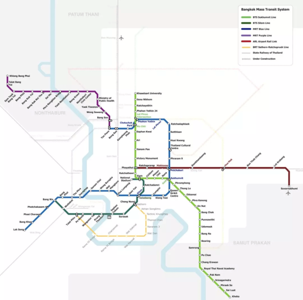说到这两年间的变化,最大的莫过于 BTS 素坤逸线和 MRT 蓝线了。在泰国生活的久的小伙伴可能知道,我们对于 BTS 从 Mo chit 站到 Bearing 站这个印象已经停留了好多年了,但随着2017 年 Samrong 站的开启,2018 年 12 月一下子又开了8 个站,分别是: