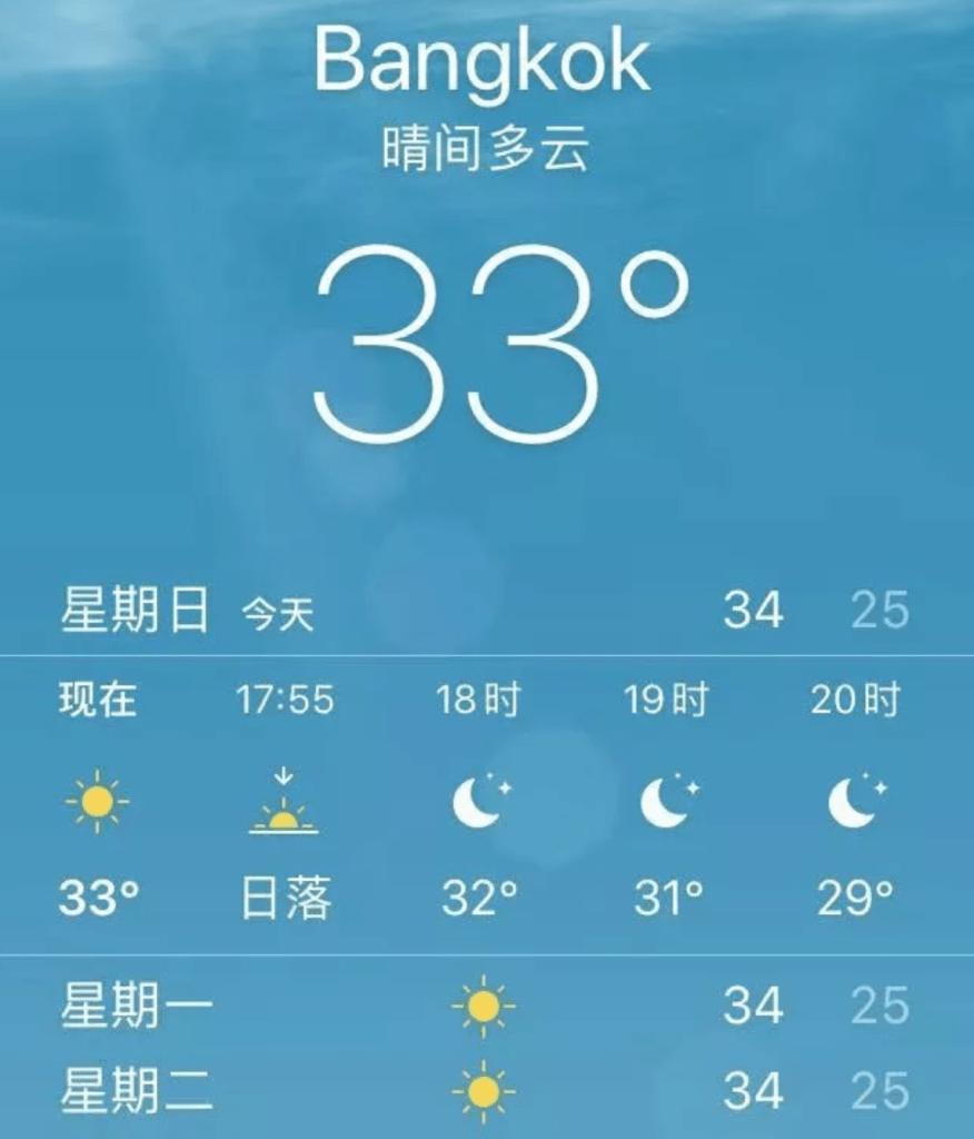 其实自从来了泰国之后,我基本不会去看天气预报,因为真的没什么必要,温度永远没什么变化,下雨从来也不准,打开天气预报看的最多的便是日出日落时间。要说泰国如果也有节气的话,这里只有两个节气,小暑和大暑。冬至永不曾至。